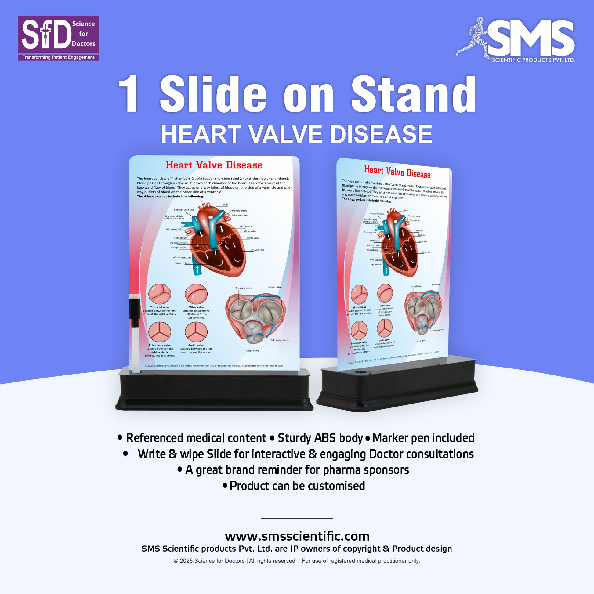 Introducing the 1 Slide on stand, an essential tool designed to enhance doctor-patient interactions and improve patient education. Built with a sturdy ABS body, this slide offers durability and long-term usability. The attached tray provides convenient storage for the included marker pen, making it easy to update the slide during consultations.
