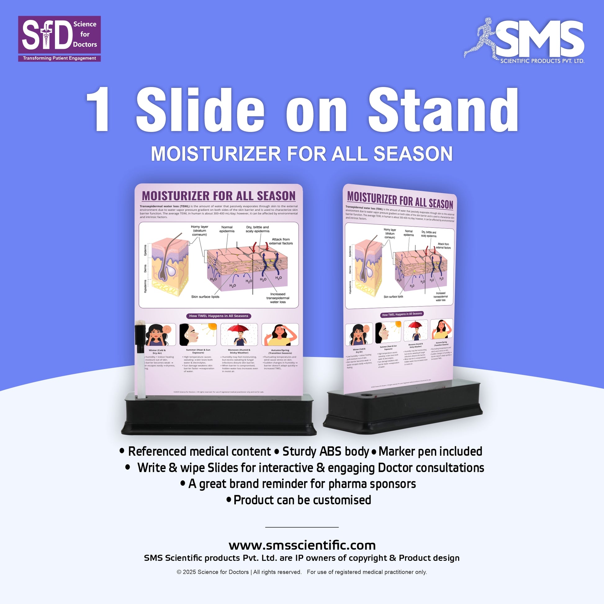Introducing the 1 Slide on stand, an essential tool designed to enhance doctor-patient interactions and improve patient education. Built with a sturdy ABS body, this slide offers durability and long-term usability. The attached tray provides convenient storage for the included marker pen, making it easy to update the slide during consultations.